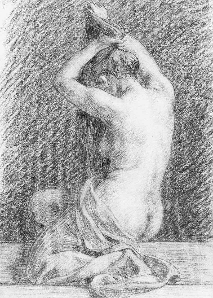 A charming, beautifully textured black and white sketch of a lady grooming her hair after bathing.