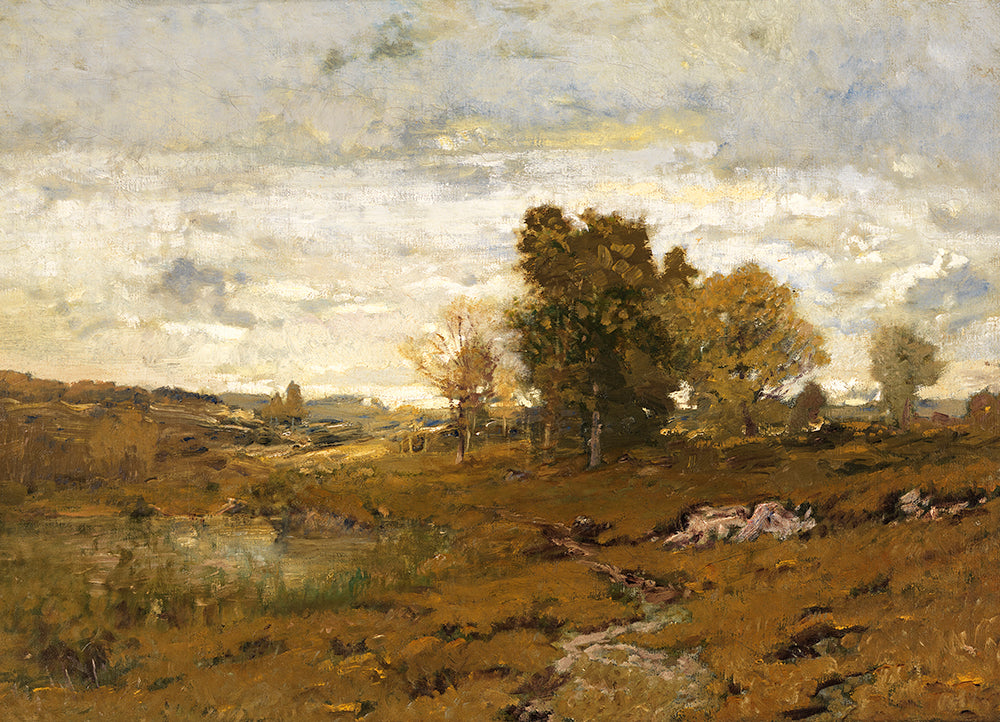 A rustic, vintage landscape painting.