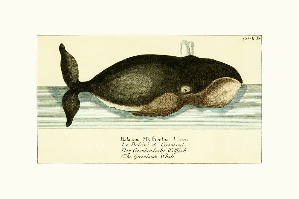 A delightful illustration of a whimsical vintage Greenland Whale. Perfect for a child's room.