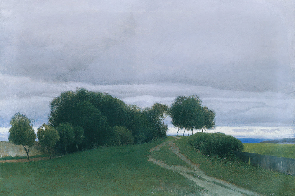 A beautiful painting showcasing a winding road through picturesque countryside. Although soft in appearance it has a wonderful stippled brush technique.