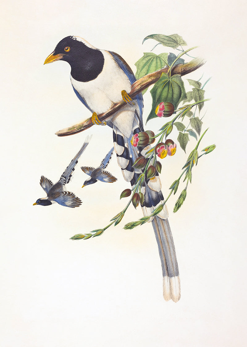 A charming study of a blue and black bird on a branch with foliage. Part of a pair.