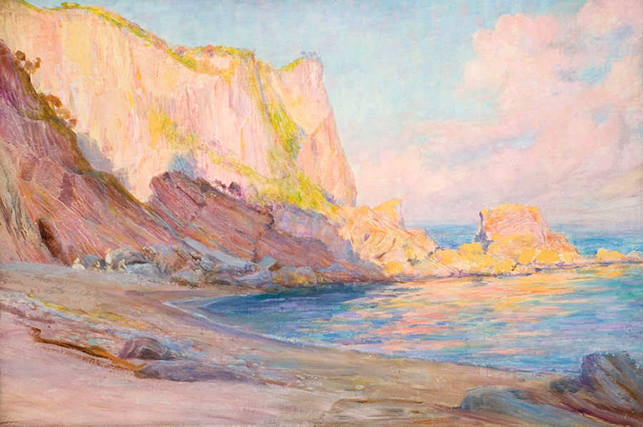 A serene pastel beach painting in the impressionist style, illuminated by the soft glow of early evening light. This prints textured finish will add instant warmth and dimension to your space.