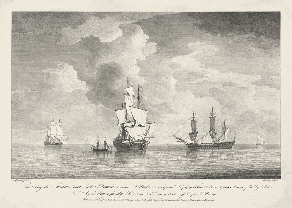 A vintage lithograph of tall ships in a sea battle. Part of a pair.