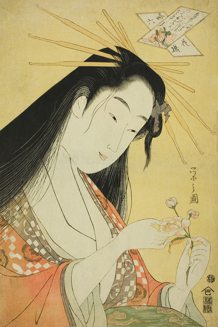 A softly coloured, traditional Japanese style painting of an oriental lady.