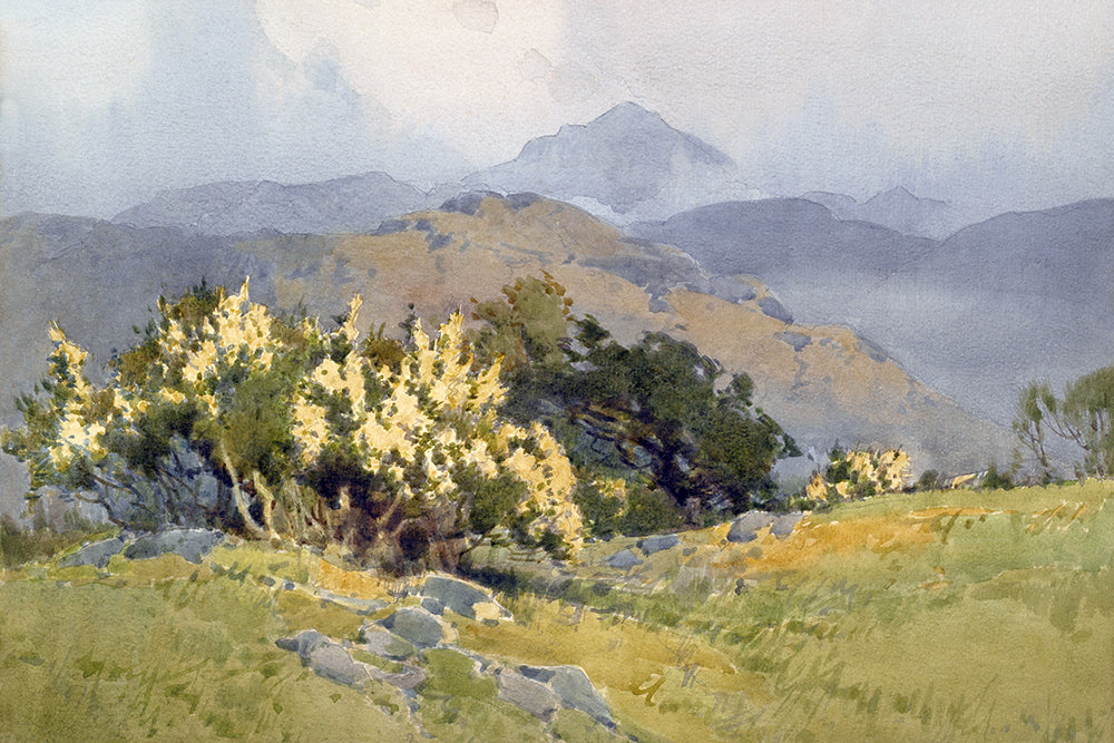 An ambient landscape painting of lime coloured trees with mountains in the distance.