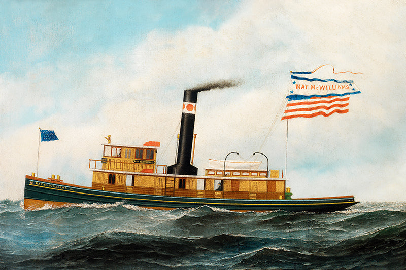 A delightful vintage painting of a steam boat called the May McWilliams. Its charm makes it a great addition for a boys bedroom or boat-themed gallery wall, its unique style will add character and interest.