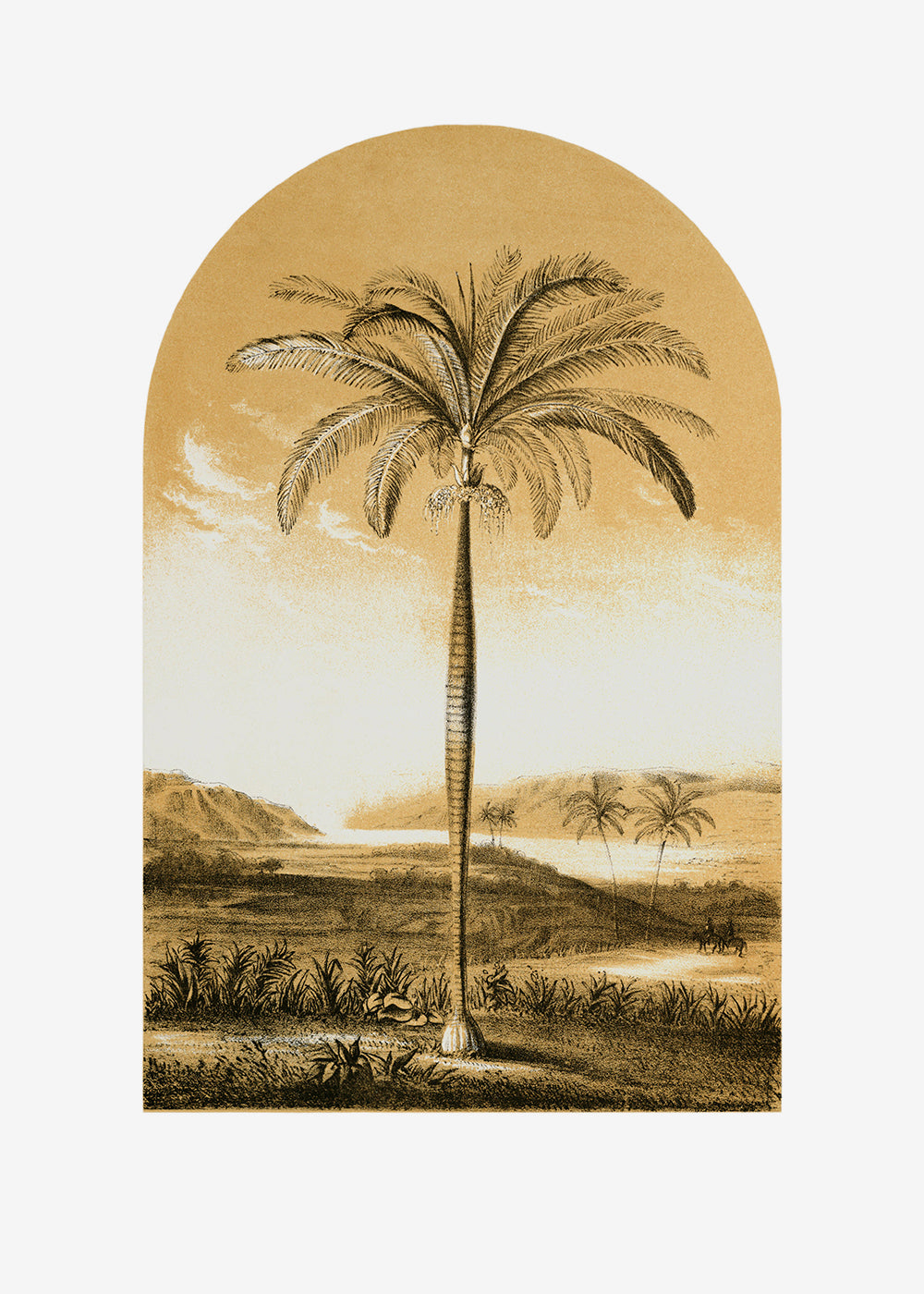 This print, framed in an arch shape, features a rustic palm nestled among the sand dunes and boasts a delightful texture.