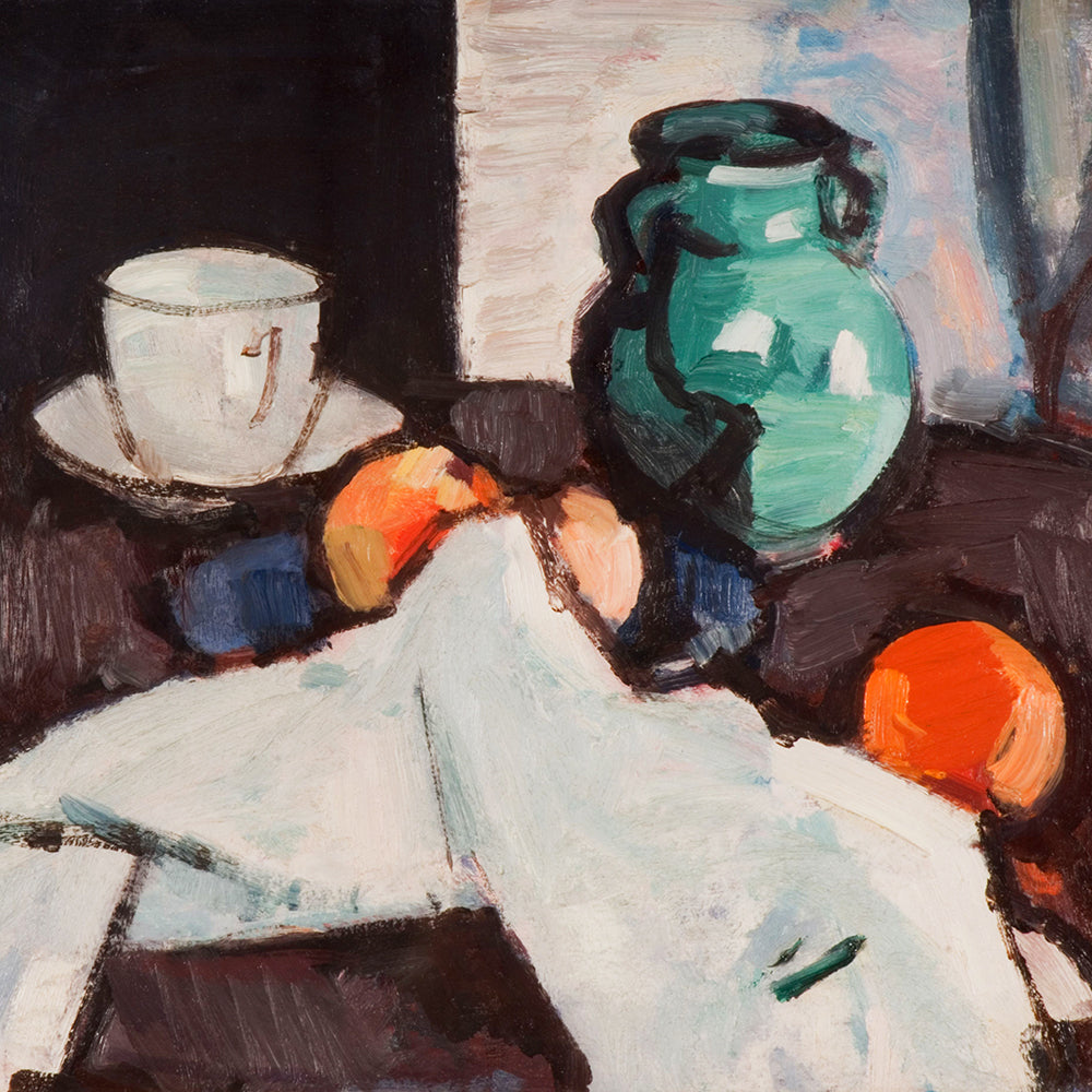 A modern bright still life painting of a jade green jug, oranges, napkin and tea cup on a table.