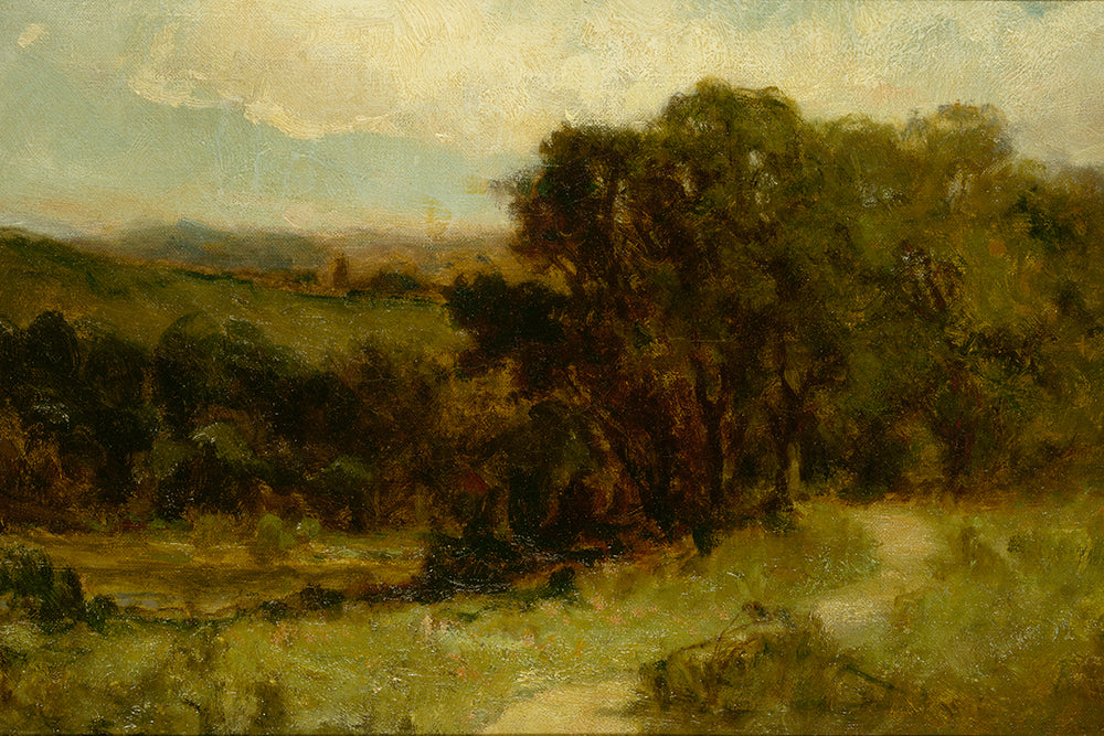 A dark and moody vintage toned landscape painting. This print has a lovely textured brushstroke finish.