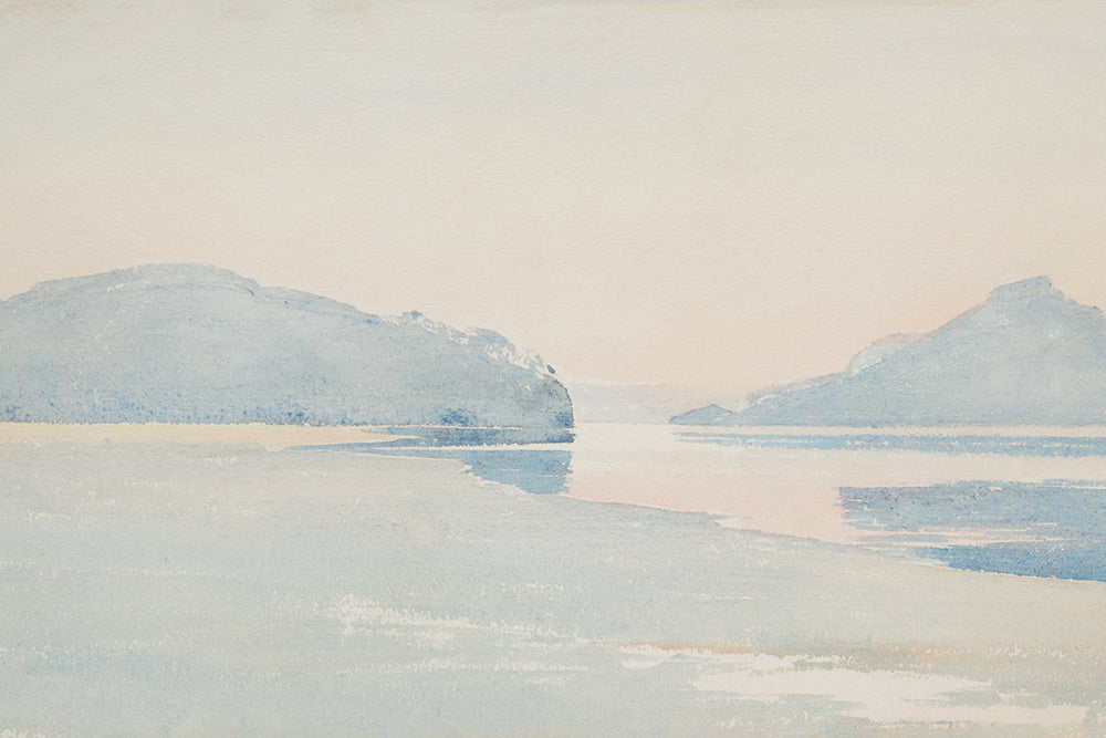 A vintage, pastel coloured watercolour of a peaceful bay.