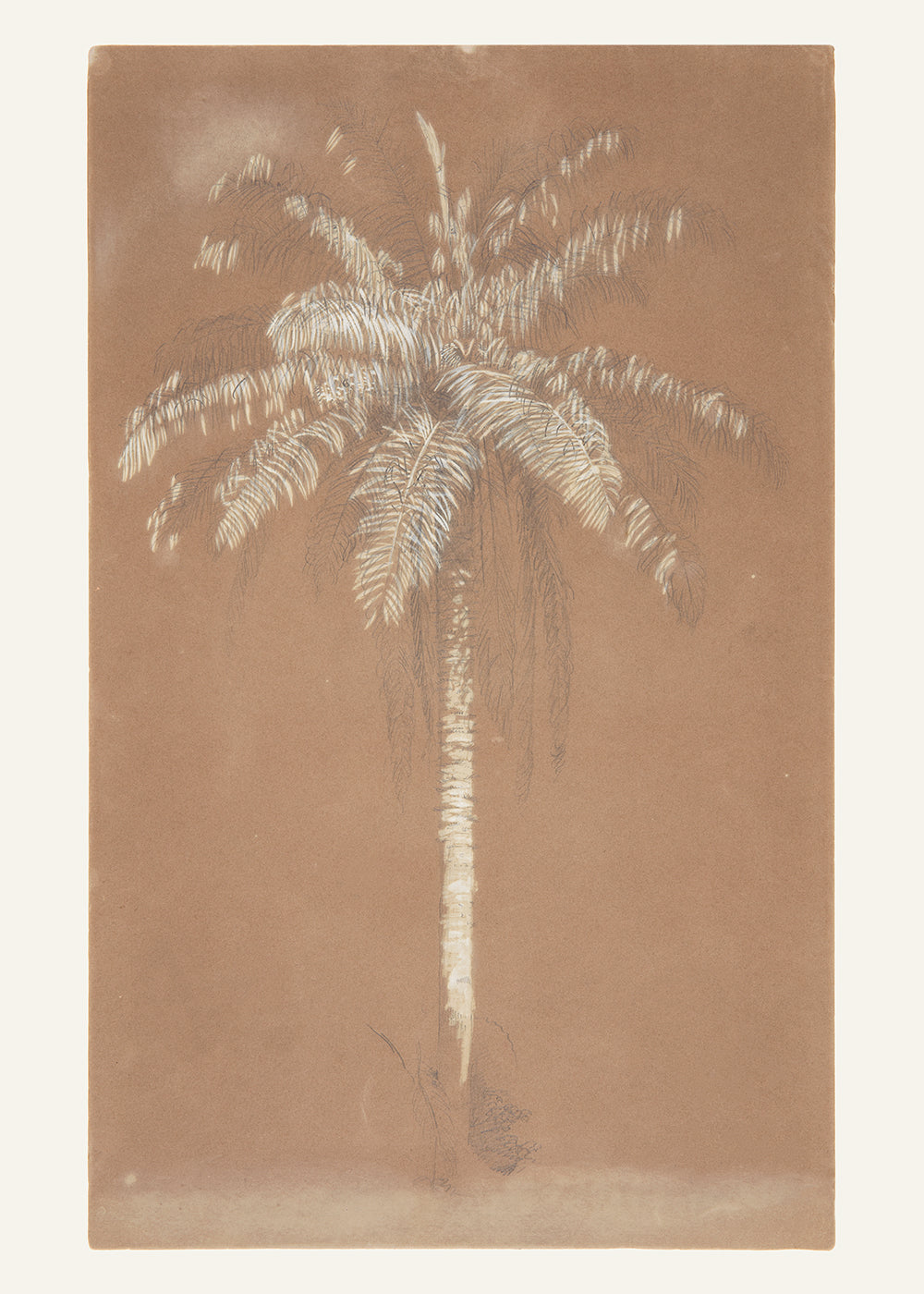 A mixed medium print with pencil detail of a rustic palm on a caramel coloured background.