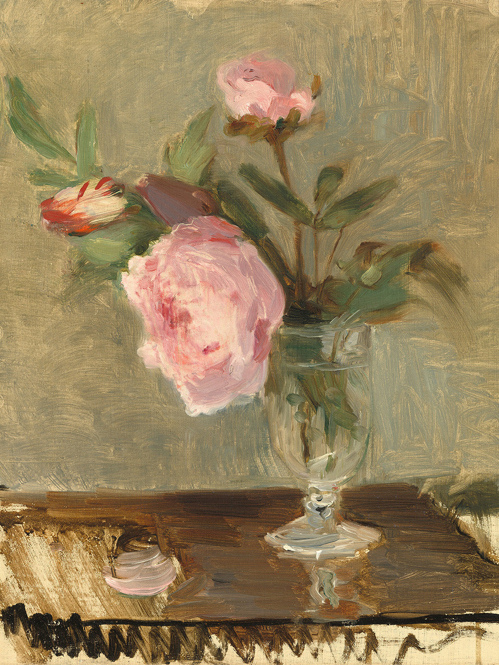 A vintage painting of pink Peonies in a glass vase.