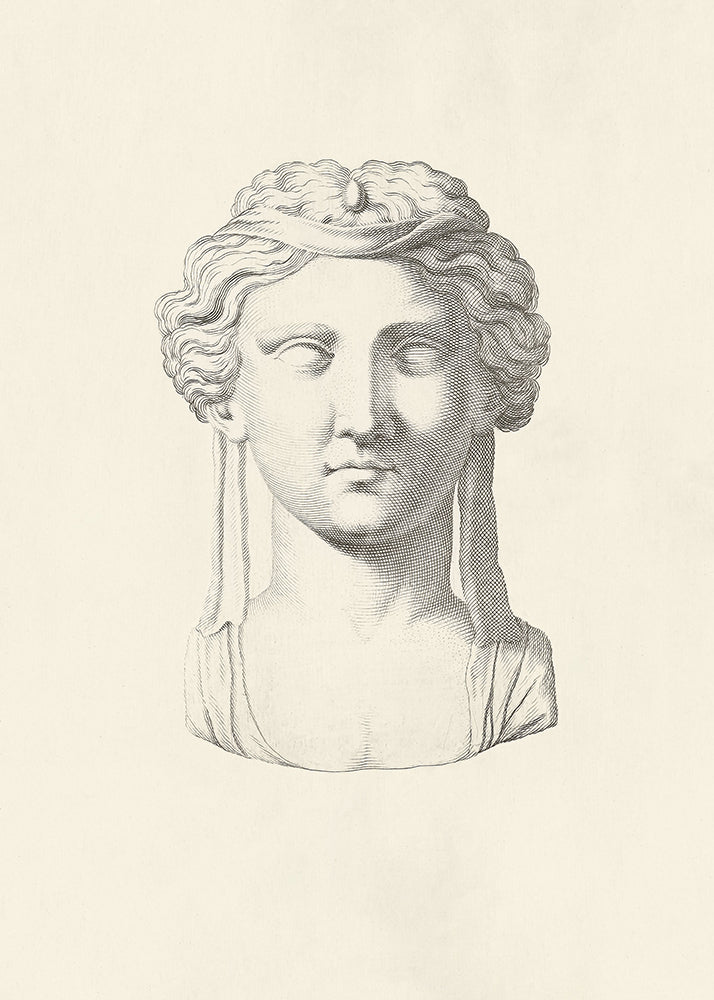 A classic lithograph featuring a sculpted bust, a regal marble portrait.