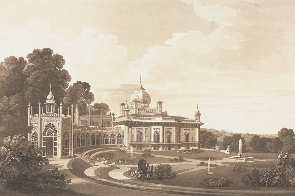 A vintage, sepia toned print of an exotic Indian inspired home set into the landscape. This print is part of a pair and suitable for most any room in the house.