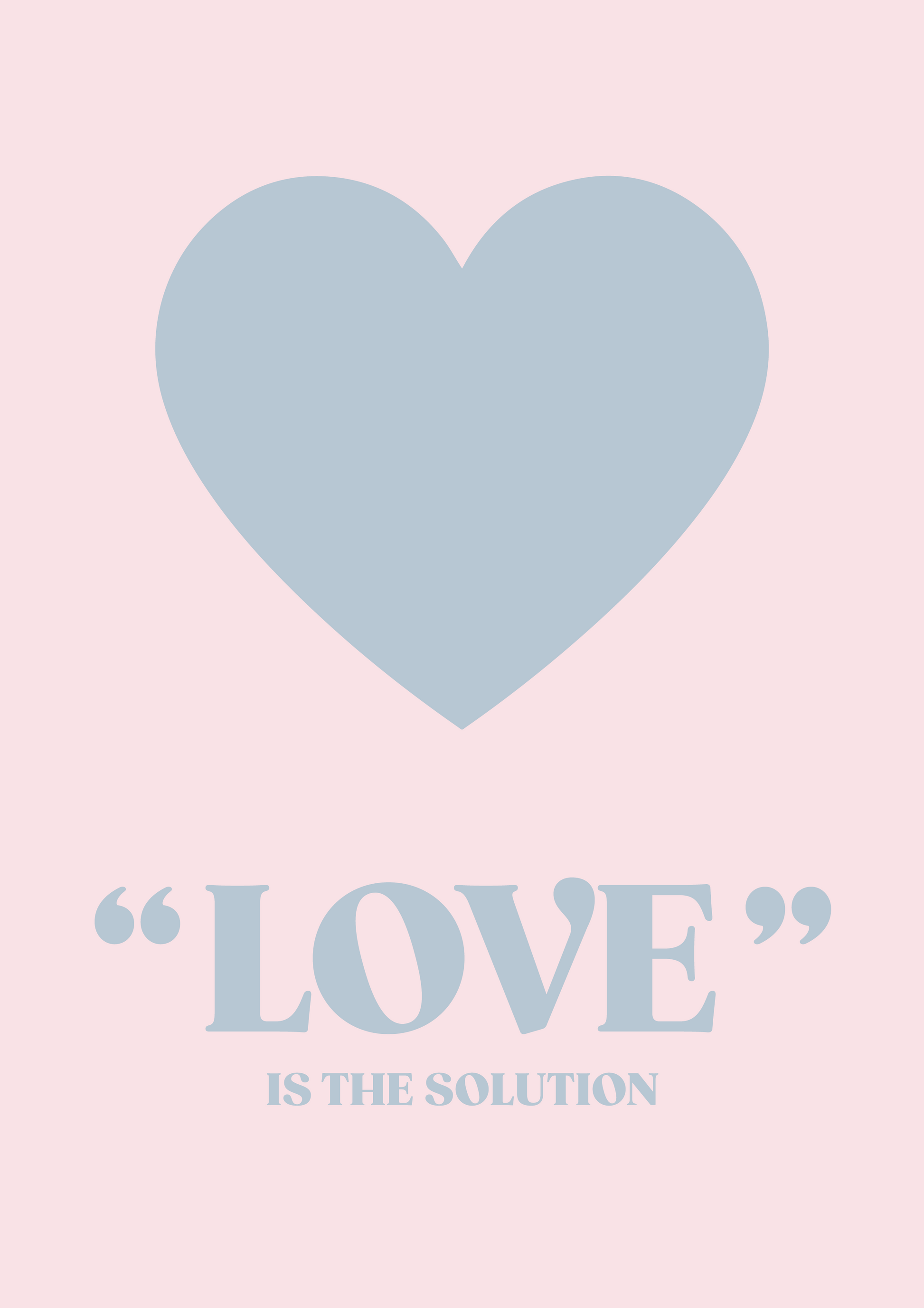 A poster featuring 'Love is the solution' in soft pink and lilac.