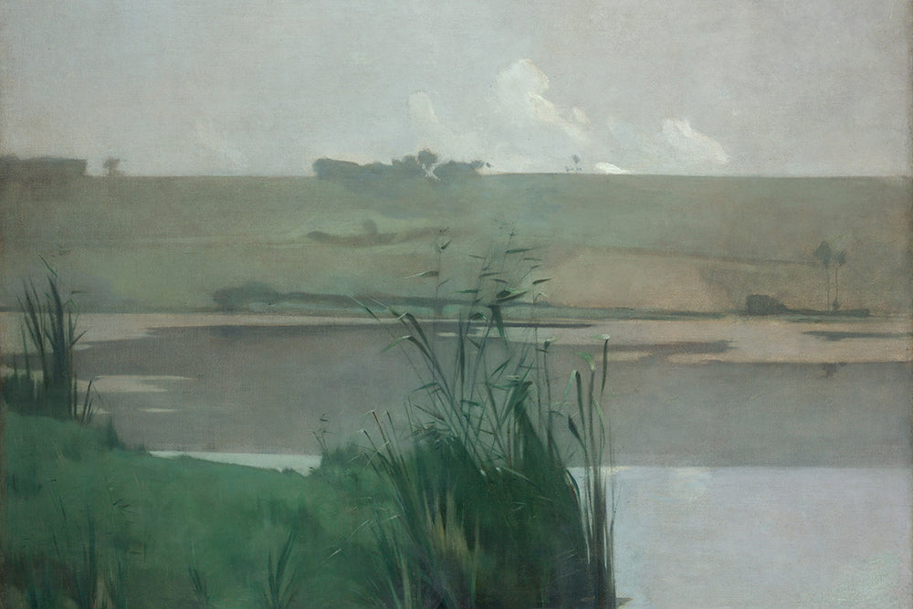 A vintage painting of a riverside view. This print has a soft rustic texture.