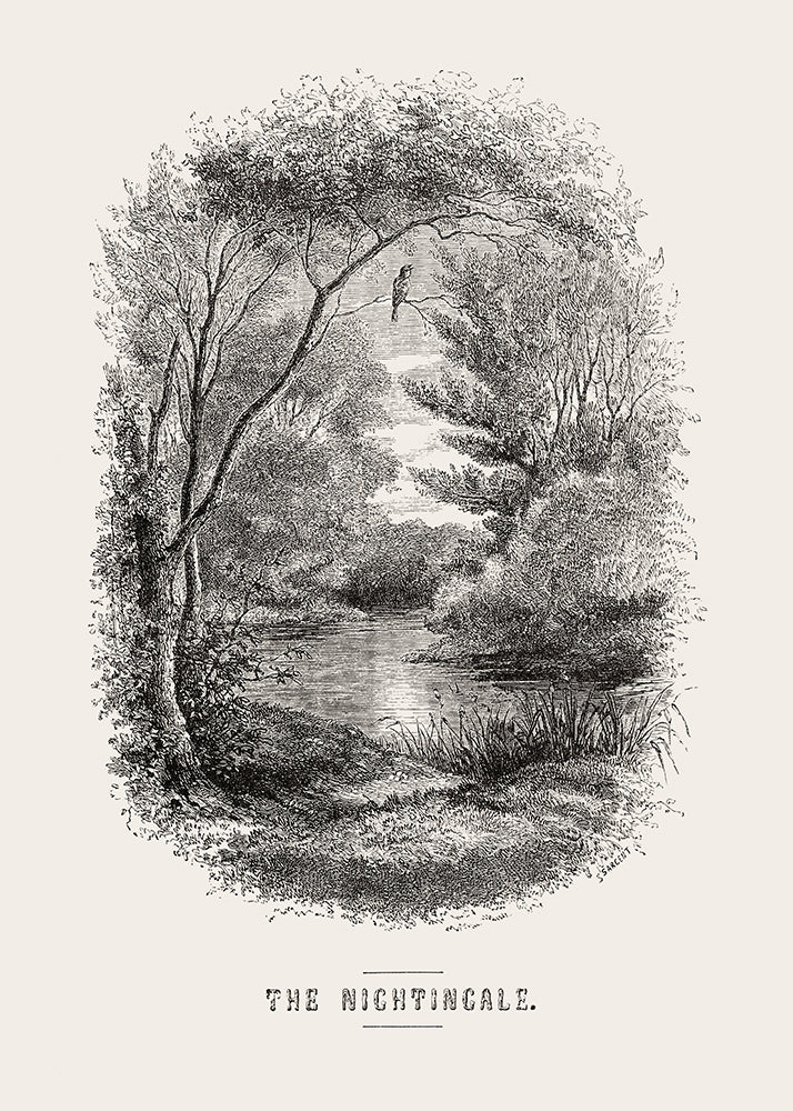 A whimsical lithograph of a Nightingale sitting on a branch. Part of a series of prints. Available as set of 4, or use on its own.