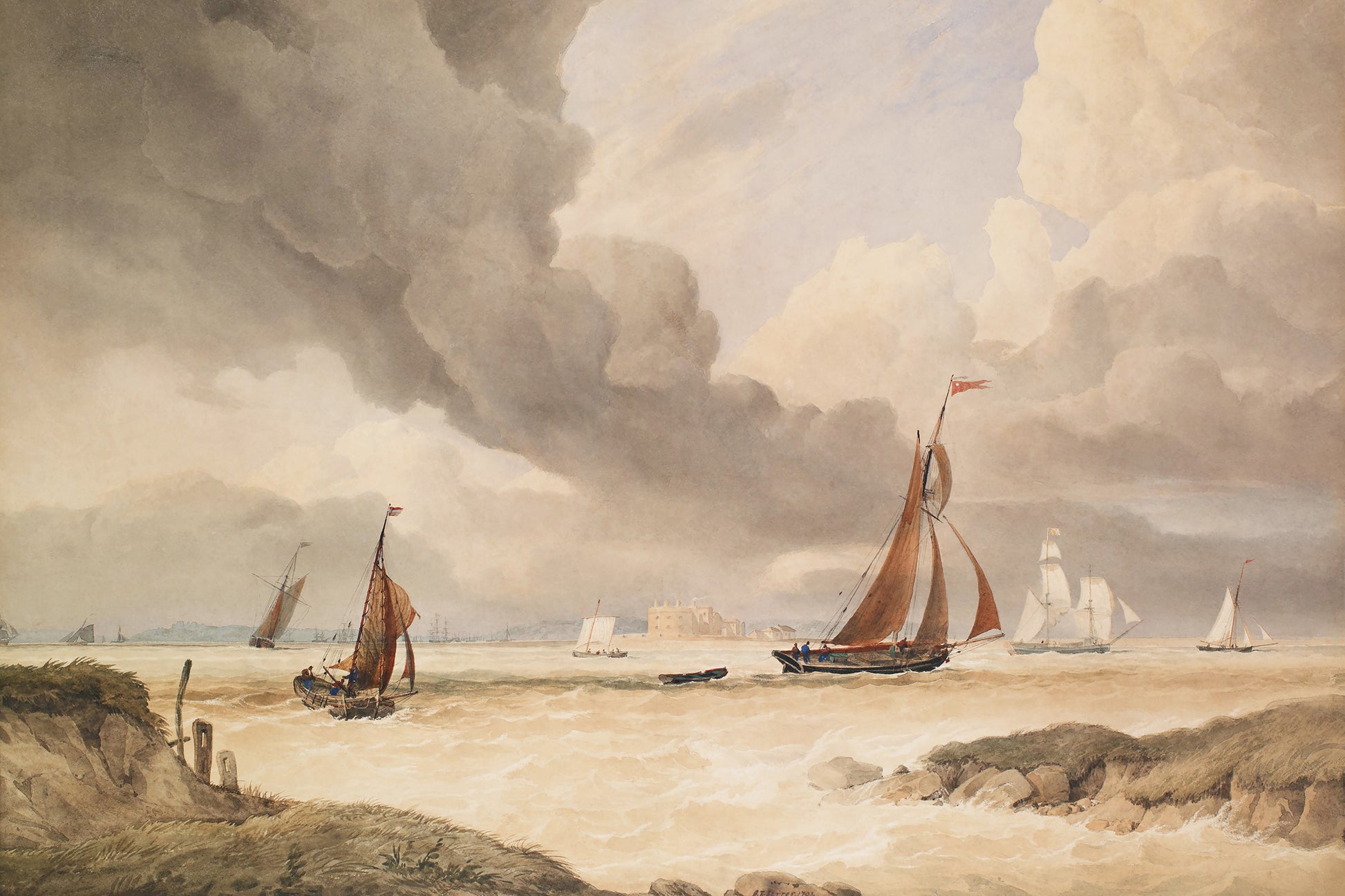A beautiful softly toned, painting of yachts at sea.