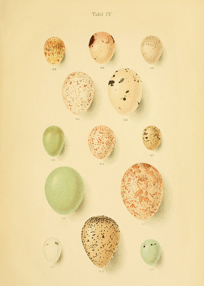 A delightful vintage lithograph of birds eggs. Part of a series of 4 prints.