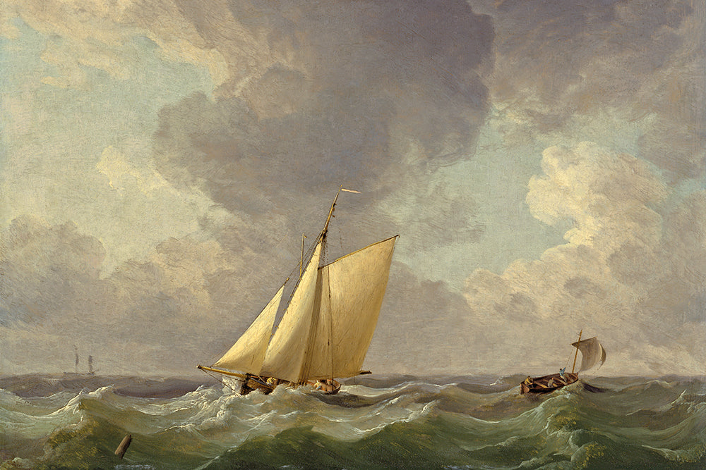 A sweet vintage painting of a small sail boat abreast a choppy sea. This print has a lovely textured patina.